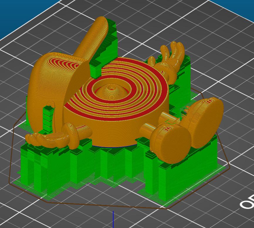 Da gerade Überhänge für 3D-Drucker eine Herausforderung sind benötigen wir recht viel Stützmaterial (hier grün)